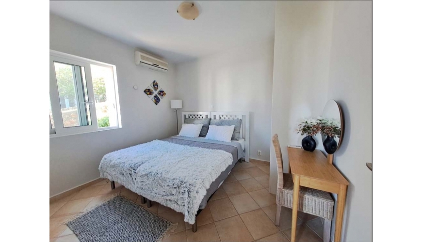 There is a double bedroom with air conditioning and a fully tiled bathroom with a corner shower cubicle, vanity units and a washing machine.