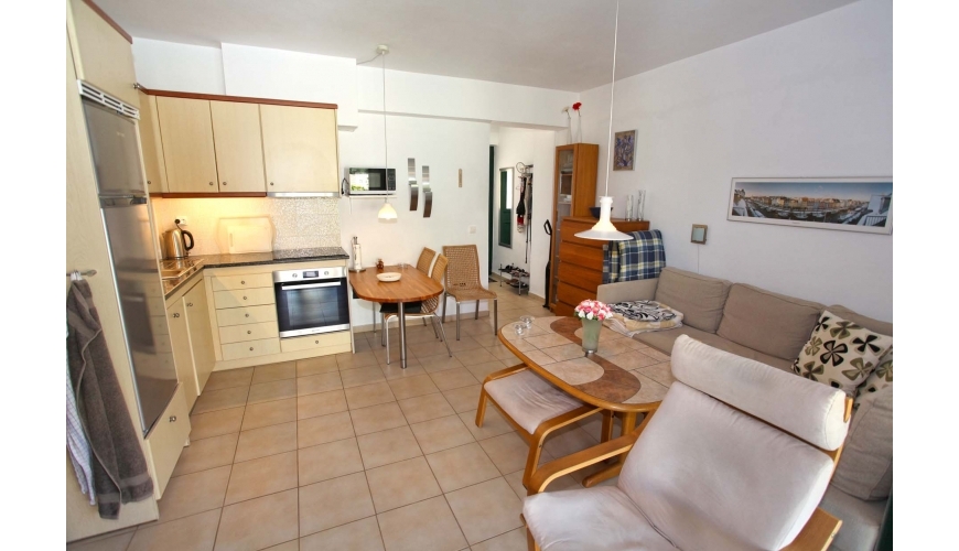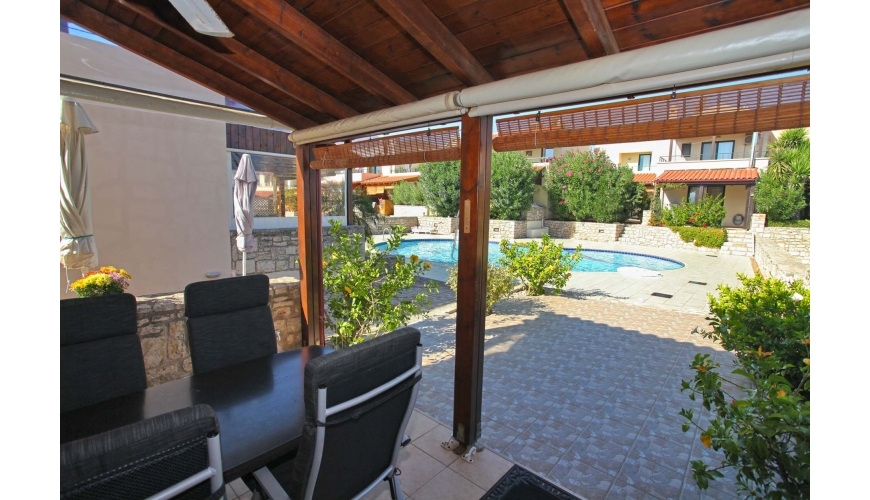 This well equipped 2 story townhouse has a spacious open plan kitchen, living and dining area. Patio doors lead out to the large covered terrace & paved patio areas overlooking the pool. One step leads down from here to the pool & the surrounding terraces plus shower area.