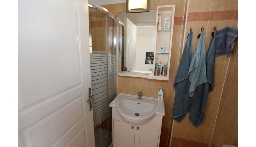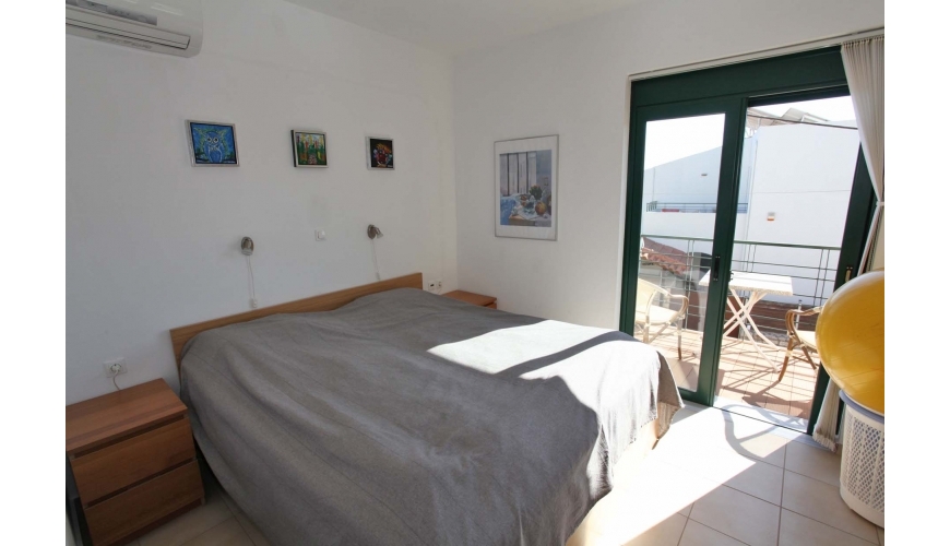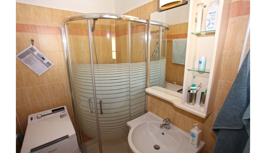 Marble stairs lead to the upper floor and a very spacious master bedroom with its own balcony. There is a very well finished shower room with a glass shower enclosure and also the washing machine.
